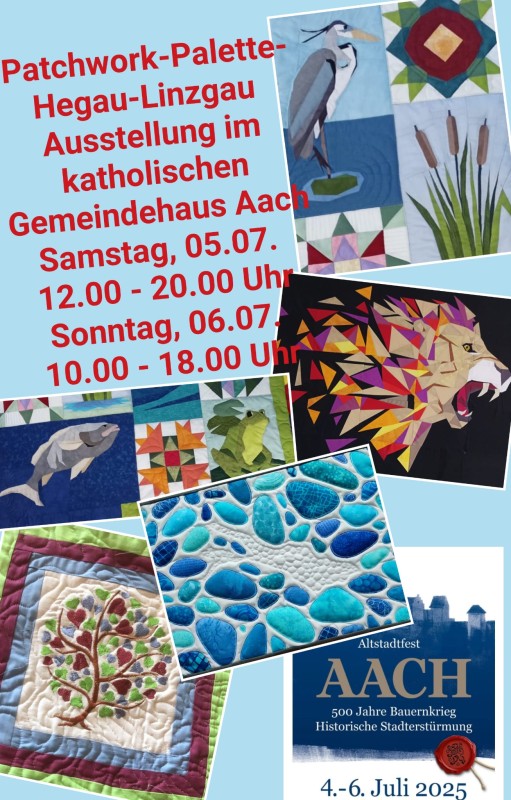Wir, die Patchwork Palette Hegau-Linzgau, werden am Altstadt Fest in Aach unter dem Thema "Natur" an zwei Tagen ausstellen. Wir freuen uns auf viele Besucher und interessante Gespräche.
