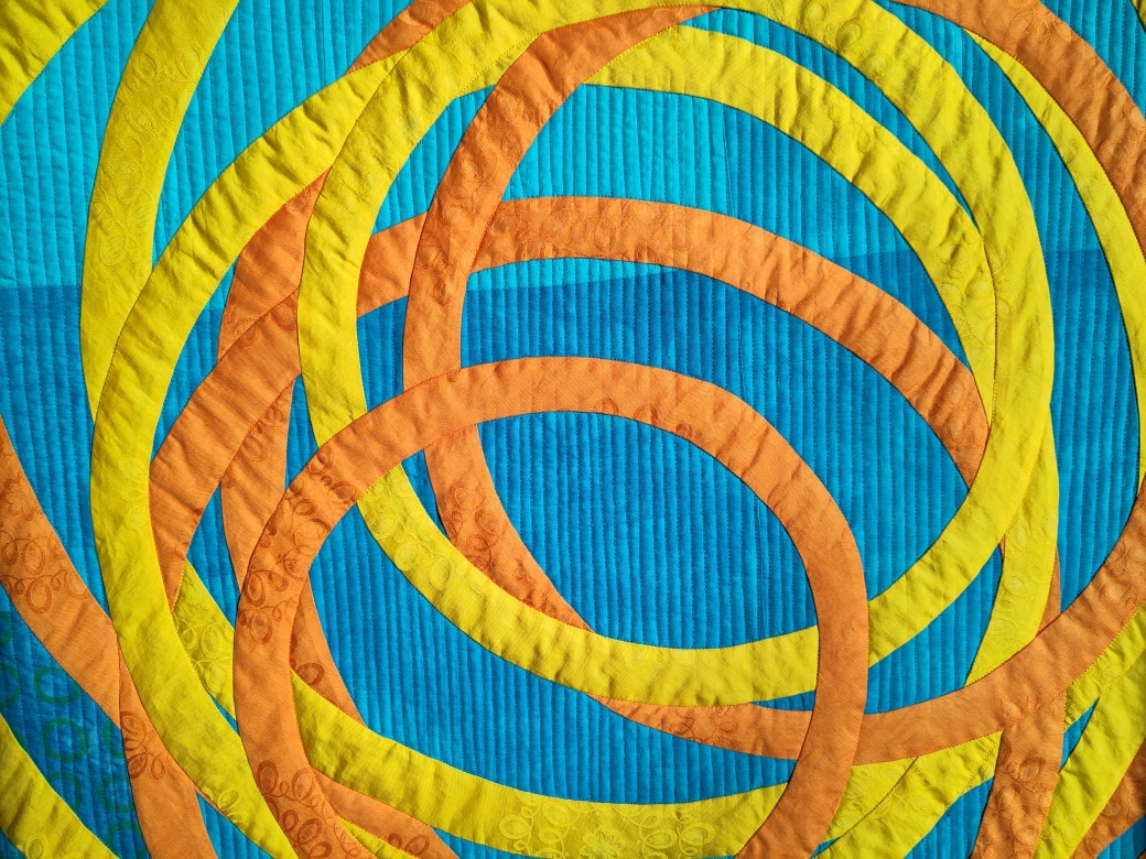 Die Quilts von Martine Schumann drehen sich um ihre Leidenschaft, den Squaredance. Sie suchte eine Möglichkeit, die Bewegungen der Tänzer auf Stoff zu bannen und deren Schwung und Eleganz darzustellen. So entstanden mehrere großformatige Quilts, voller Farben und Twirls. Martine entwickelte sogar ihre eigene Nähtechnik für die Kreise, die nicht appliziert sind!