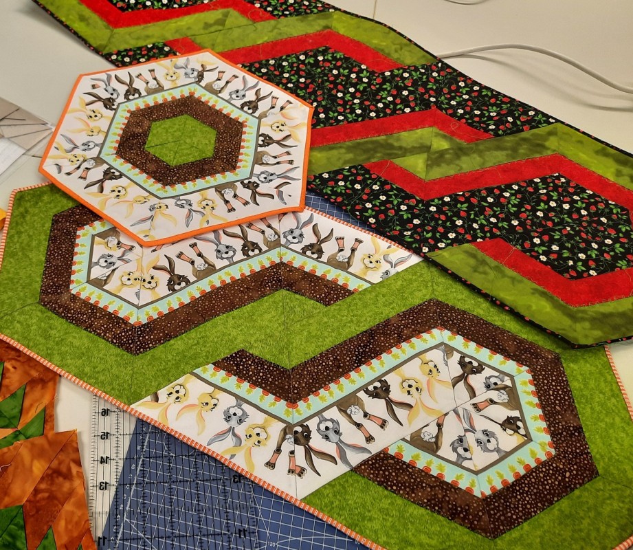 Im Mittelpunkt steht ein (nicht ganz so klassischer) Quilt, der gut für die Ostertafel geeignet ist, aber auch aus neutralen Stoffen genäht und beliebig vergrößert werden kann.