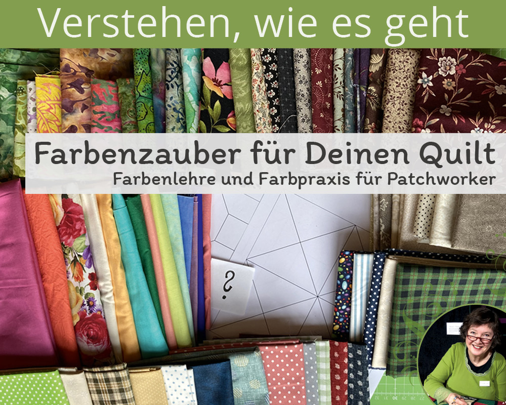 Möchtest Du lernen, Farben und Stoffe sicher zu kombinieren? Das lernst Du in meinem Kurs mit "Gunhilds-Farben-Kompass" – Dein Weg durch den Farben-Dschungel zu Deinem "Wow"-Quilt.